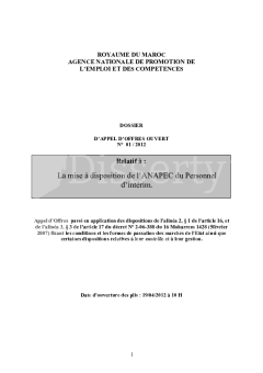 Ao012012 R R R R R RRRRR R R ROYAUME ?DU ?MAROC ? AGENCE ?NATIONALE ?DE ?PROMOTION ?DE ? L ? EMPLOI ?ET ?DES ?COMPETENCES ? R R RRRRR DOSSIER ? R D ? APPEL ?D ? OFFRES ?OUVERT ? N ? ? ? ? ? R R R R R Appel ?d ? Offres ? ?passé ?en ?application ?des ?dispo