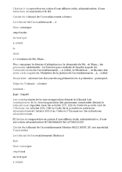 Mandat de comparution Citation à comparaitre en raison d ? une a ?aire civile administrative d ? une infraction administrative Cachet du tribunal de l ? arrondissement adresse Le tribunal de l ? arrondissement à Vous convoque requérante en tant que à h le